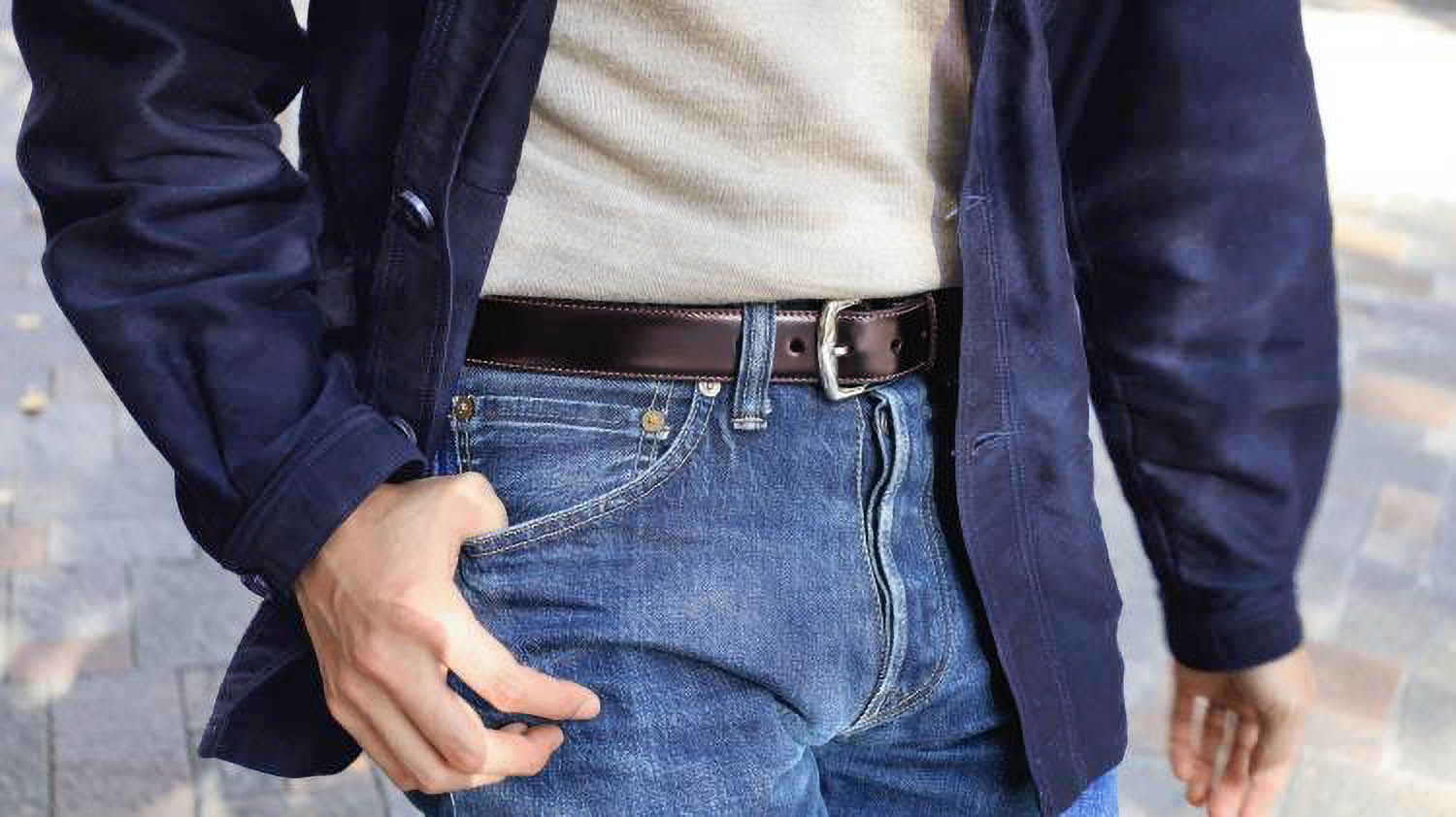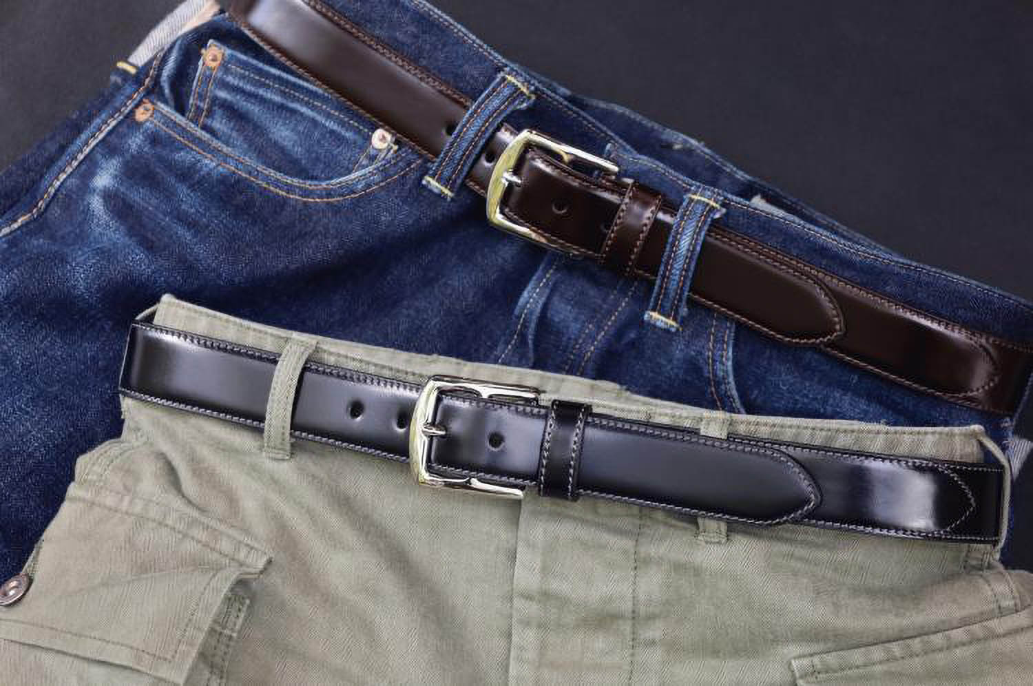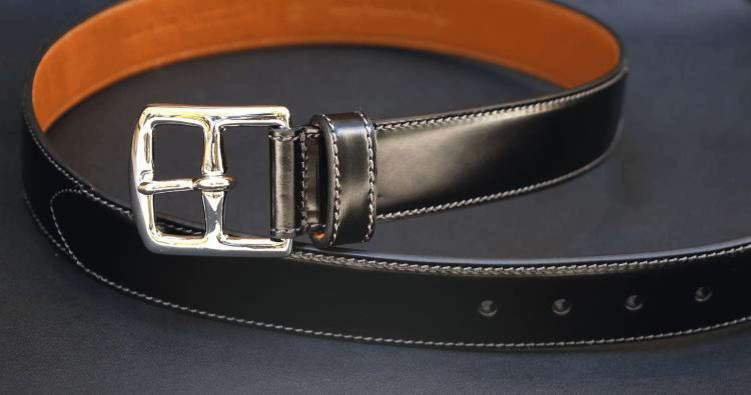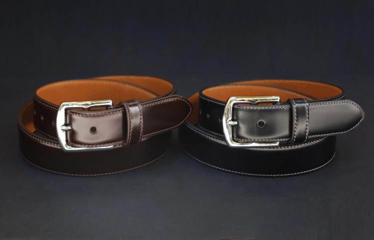 細部にも多くの拘りがありますが、まずは剣先の形。ハートカットと呼ばれるやや丸みを帯びながら先端に向かって細く削るデザインを採用し、馬具バックルのバランスと好相性。サイドのレイヤード部分にも同じカットを用いています。 そして、その剣先を美しく見せるセミフラットの程よい膨らみ。カジュアルベルトは芯地を使用しないフラットなものが多く、ドレスベルトは床革などを表面と裏面の間に入れるのが一般的。今回はその中間な雰囲気に仕上げる為、芯地を用いず革の裁断・漉き・ステッチングで膨らみを表現しています。更に、ステッチはやや番手を太くすることで視覚効果により水染めコードバンの美しさをより際立たせたものに仕上げています。