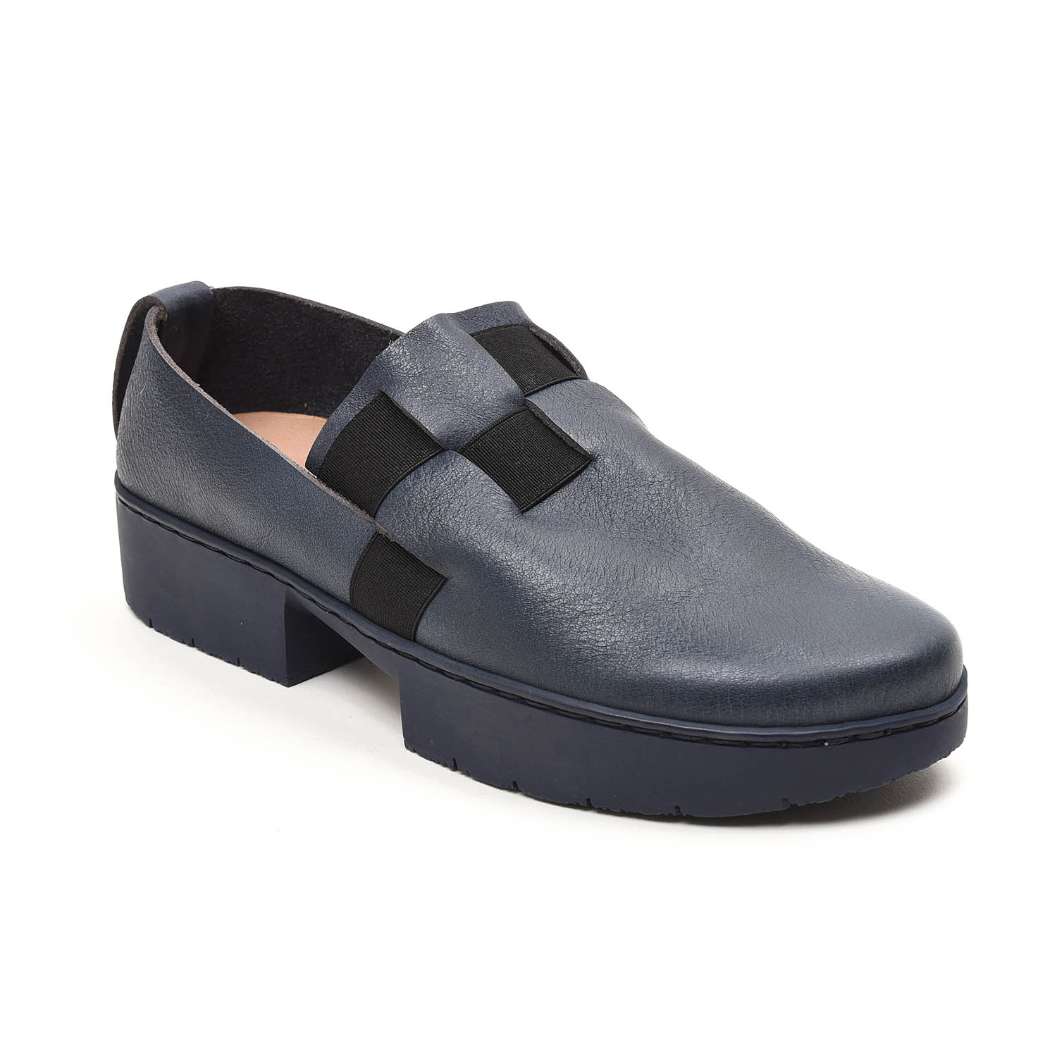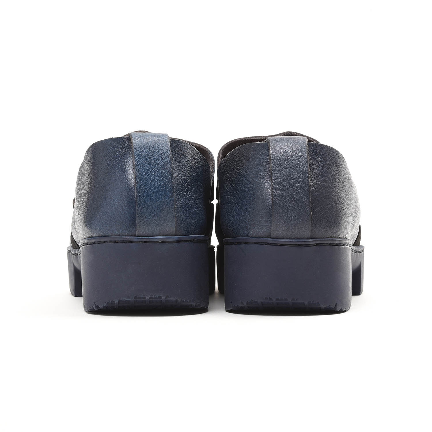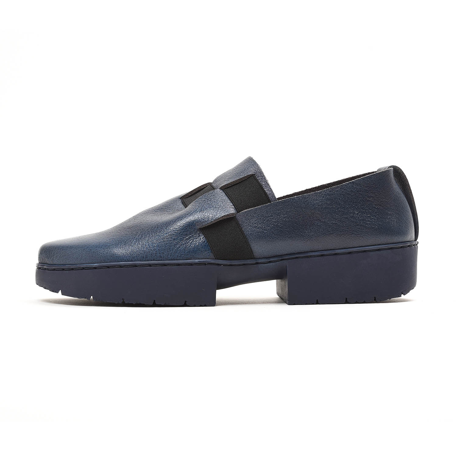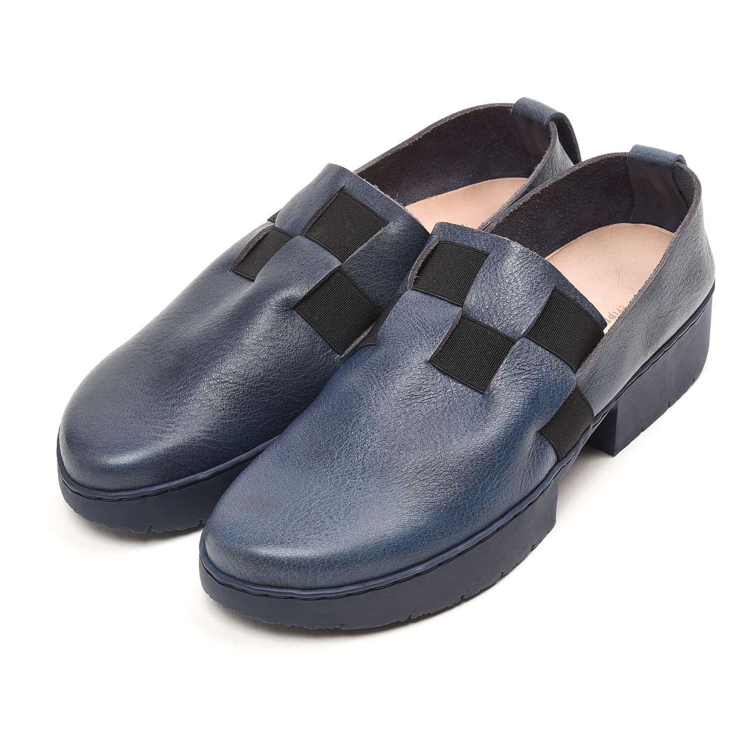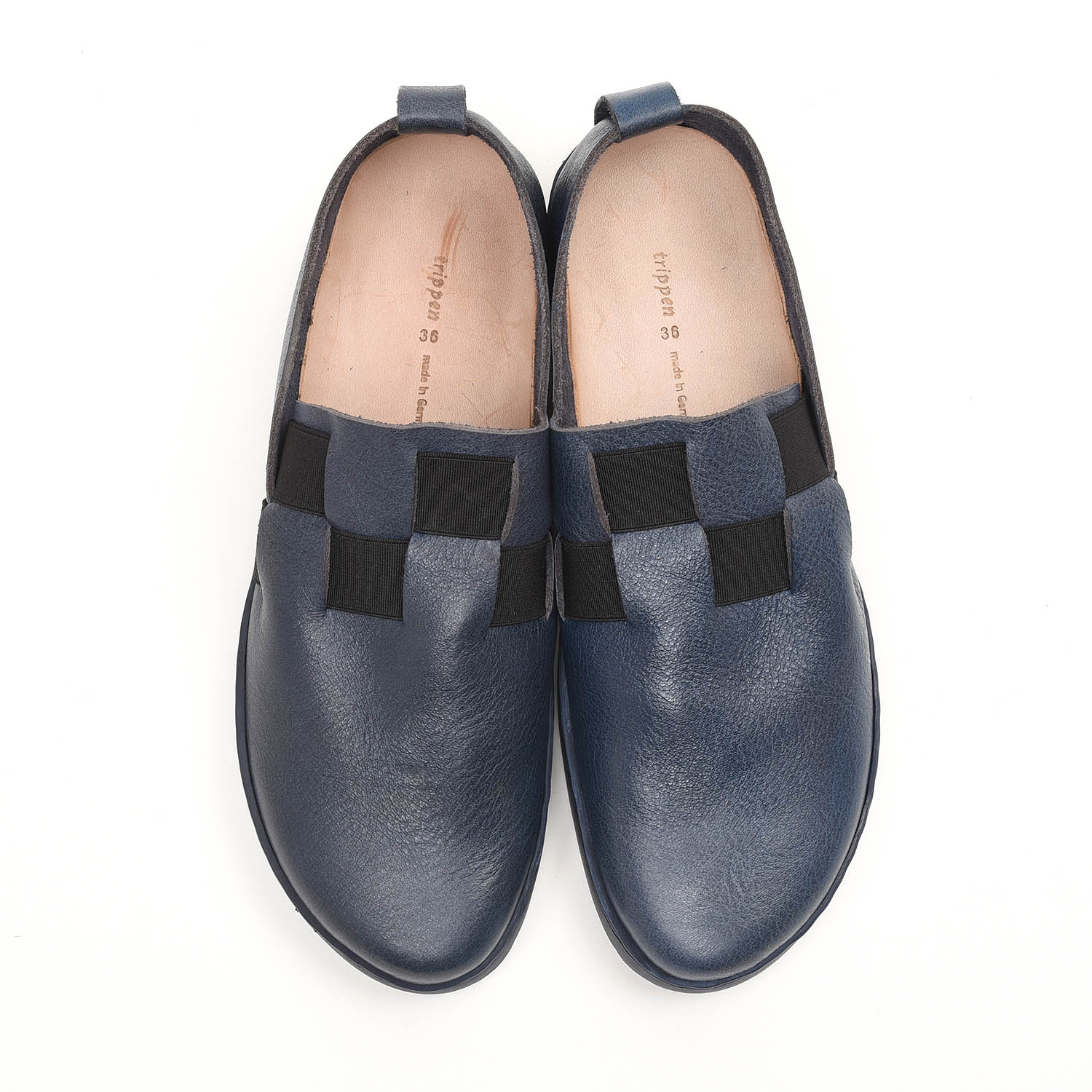 市松模様の格子柄が目を惹くトリッペンQUAD。色は、ブルーのLHTレザーとネイビーのSPORTソール。格子柄の黒い部分は、甲部分が伸縮するデザイン。全体的な足入れ感はとても開放的なので、厚手のソックスで履いてもOK。革が良く伸びるので、少し小さめに選んでおくとフィット感よし。