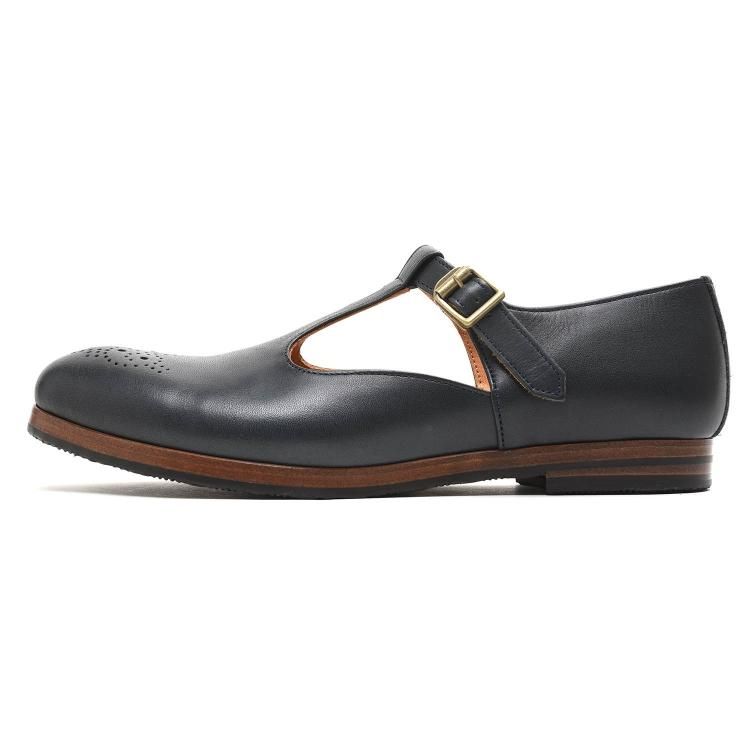 革色はネイビー。しっとり感のある革で落ち着いた雰囲気。大人の女性の上品さを醸し出しつつカジュアルに履いて頂けます。コバ部分はブラウン染色されていて、よく木と間違えにれますが、ここも本革。だから履けば履くほど革ならではの風合いがどんどん出て来るTストラップシューズなのです。