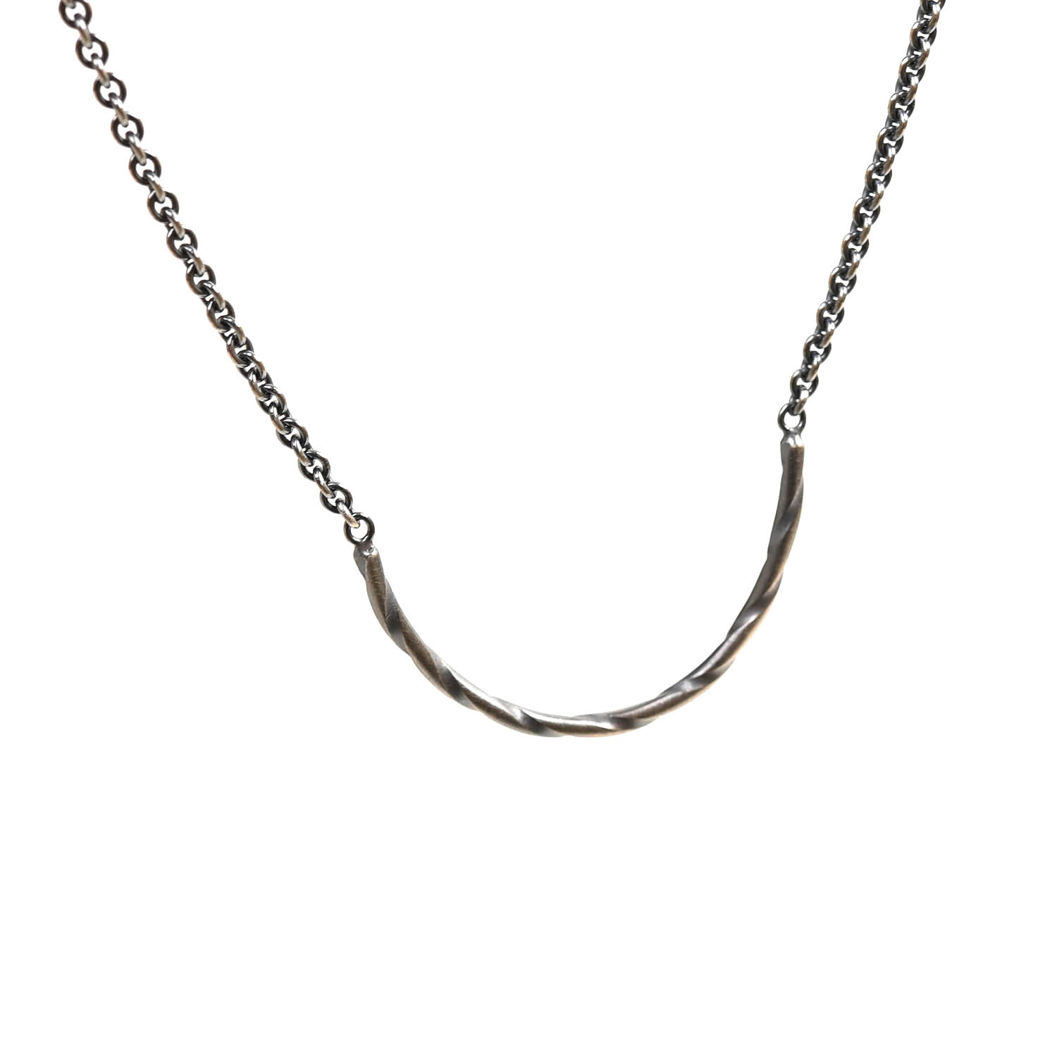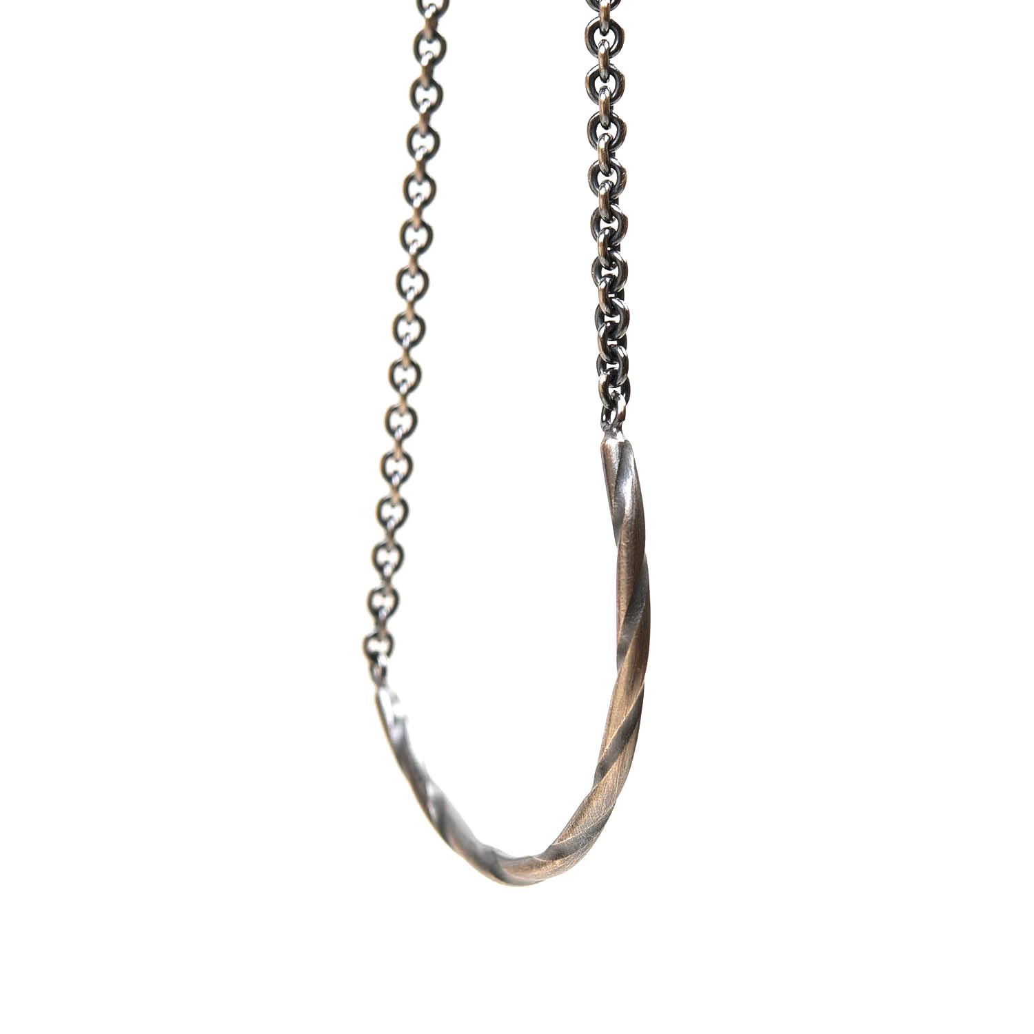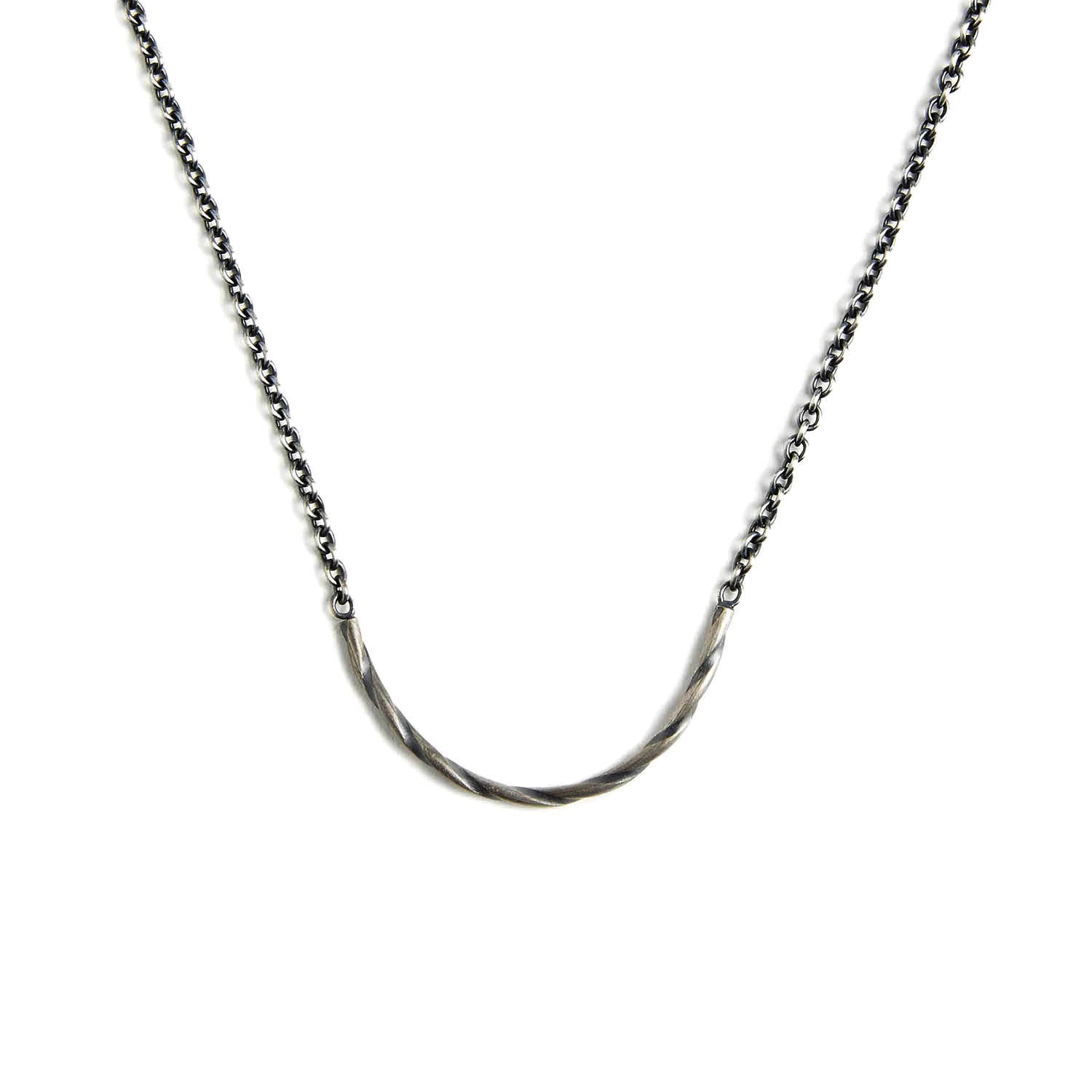 Rotary Necklaceは、スターリングシルバー(.925)を使用し、パティーヌ加工を施しています。ハンドメイドのテンションベースのクロージャーには、クロスしたハンマーのホールマークが入ります。細いツイストデザインのペンダントが秀逸。全長28インチ(71cm)、チェーン長さ24インチ(61cm)。