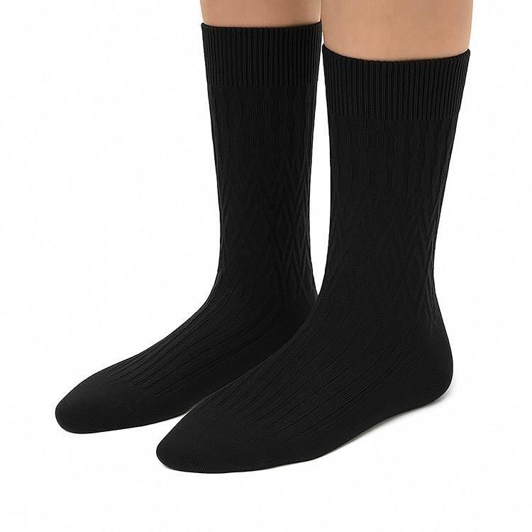 装飾を削ぎ落としたミニマルな佇まいに、上質な質感が際立つ一足です。履き口のリブは適度なフィット感を保ちながら締め付けを軽減し、長時間の着用でも快適。ジャガード編みの立体感が、さりげない個性と大人の上品さを演出します。ビジネスからカジュアルまで幅広く活躍する、洗練されたソックスです。