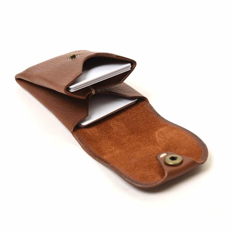 シンプルな折り紙スタイルのカードホルダーは、1枚の革からできるだけステッチを省いて折り紙を折るように作られています。すっぽりと手に収まるサイズ感とハンドメイドの暖かみを感じるデザインで、2層に分かれたポケットにより合計16〜18枚ほどのカードを収容可能です。(使い慣れるとさらに増えます)