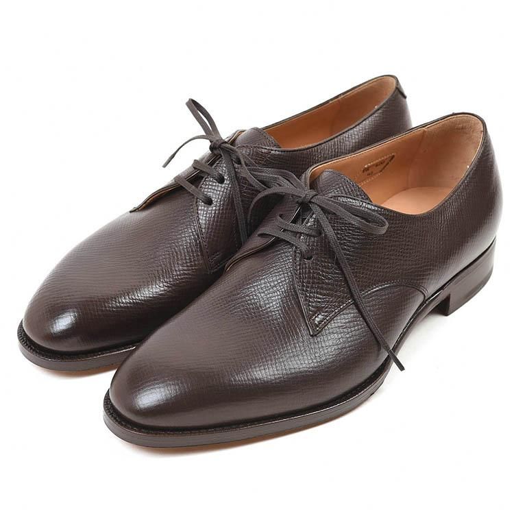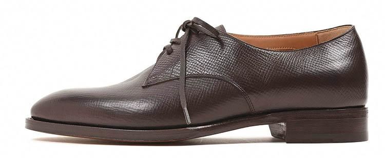 多くのラストを生み出しているジャコメッティ社の最も新しい木型「GRIGIA(グリジア)」を使用した外羽根プレーントゥ。オブリークトゥとも呼ばれるインサイドストレート+アウトサイドカーブの理想的な設計から機能美すら感じます。ウエスト(土踏まず)部分は適度に絞り込まれ、そしてリフトアップされる感触もありつつ、開放感のある指周りの収納性はお見事で、業界内外から熱い視線を浴び続けるドレスシューズです。