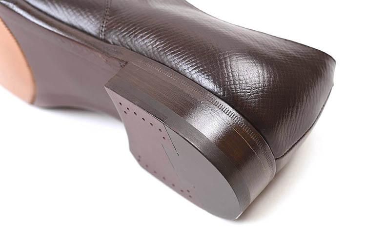 アッパーレザーは、ユタカーフEBENE(黒檀調の濃いダークブラウン)を採用します。質感的にはホーウィンのハッチグレインに酷似しています。いわゆる鹿革に見られる模様を再現した革で、古くはロシアンカーフが源流となります。交錯するマス目模様の型押しが施された牛革で丈夫かつしなやかな履き心地が楽しめます。雰囲気のある履きじわも楽しめますし、メンテナンスも比較的楽です。不意の雨でもさほど心配は入りませんが、防水能力のあるクリーム類でのケアをしておけばベストです。