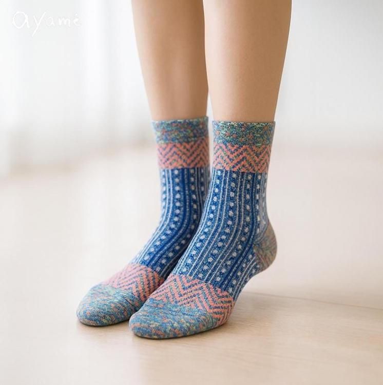 Ayamé「Sprinkles socks」は、まるでコンフェッティを散りばめたような遊び心あふれるジャカード編みが特徴の一足です。鮮やかなブルーを基調に、コーラルピンクのジグザグ模様や多彩な糸の色が立体感を生み、足元をアートのように彩ります。柔らかなコットンとナイロンの混紡糸を使用し、フィット感と耐久性を両立。日本国内の熟練工場で丁寧に編み上げられた高品質なソックスです。