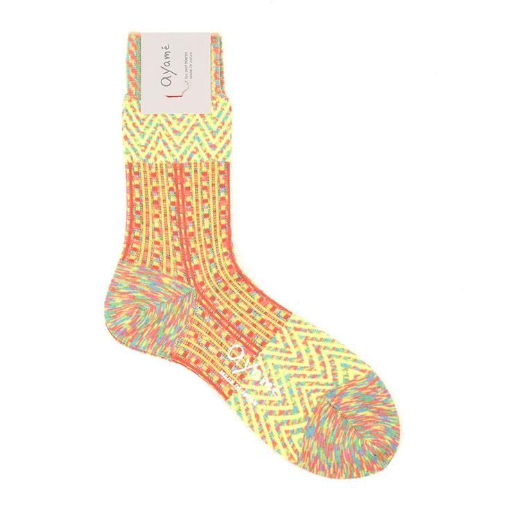 『ayame Sprinkles socks AYM010/2502/N』は、独自のマルチカラーをジャカード編みで表現した印象的なクルー丈ソックス。鮮やかなイエローをベースに、オレンジやグリーン、ブルーを織り交ぜた立体感のあるデザインは、足元を一瞬で華やかに彩ります。柔らかなコットンナイロン混紡で編み上げられており、優しい肌触りと快適なフィット感を兼ね備えています。