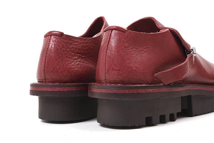 Trippen『FIELD waw-Berry』は、既存の枠を軽やかに飛び越える“唯一無二”の存在です。深みのあるベリーカラーは、赤すぎず紫すぎない絶妙なトーンで、合わせるだけでスタイルにモードな華やぎを与えます。そして本作最大の特徴は、Heavy感のあるTraceソールに、通常展開のない“Marron(マロン)カラー”を組み合わせた当店別注仕様であること。アッパーとソールの色を緻密に響き合わせたことで、視覚的な一体感と彫刻のような立体美がより際立ちます。大胆なメタルジッパー、厚みあるソール、丸みのあるフォルム――そのすべてが調和し、「履く」という行為自体をファッション表現へと昇華させる一足です。
