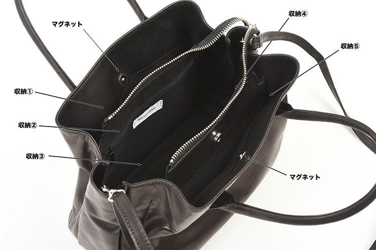 機能2WAY(手提げ+ショルダー)/中央に蓋付き収納、左右に両脇収納スペース