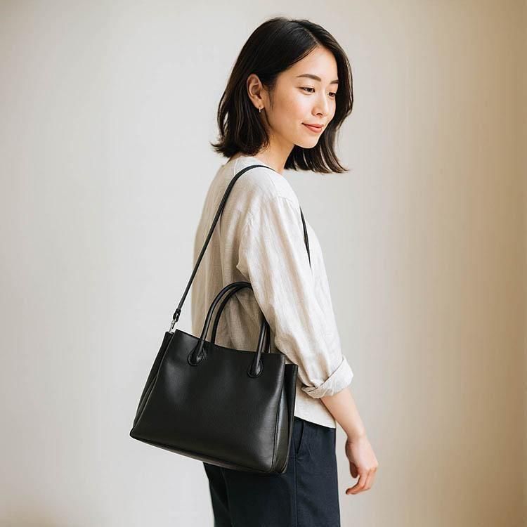 LEBASIC「LE-2523」は、上品さと抜け感のバランスが絶妙な“理想のベーシック”。目立ちすぎないのに、ふとした瞬間に「素敵なバッグですね」と褒められる——そんな洗練された存在感があります。ブラックレザーは光の加減で表情を変え、手に取るたびに高揚感を与えてくれる上質な素材。手提げでも肩掛けでも美しく見えるよう計算された2WAYデザインは、通勤にも休日のカフェにも自然に溶け込みます。「きちんと感」と「こなれ感」を一つで叶えてくれる、大人の女性のための名品です。