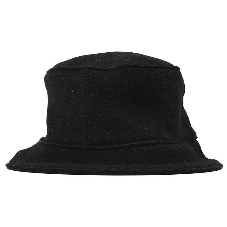 ヴァージンウール100%で仕立てた、柔らかくしなやかなフエルト素材のバケットハット。芯地をほとんど使わない一枚仕立てにより、頭に自然に馴染む上質なフィット感を生み出します。切りっぱなし風のブリムと立体的なステッチワークが、掠りの入った黒のワントーンに奥行きを与え、静かでありながら確かな存在感を放つデザイン。スタイルに溶け込むミニマルさと、装いの軸になる力強さを併せ持つ一品です。
