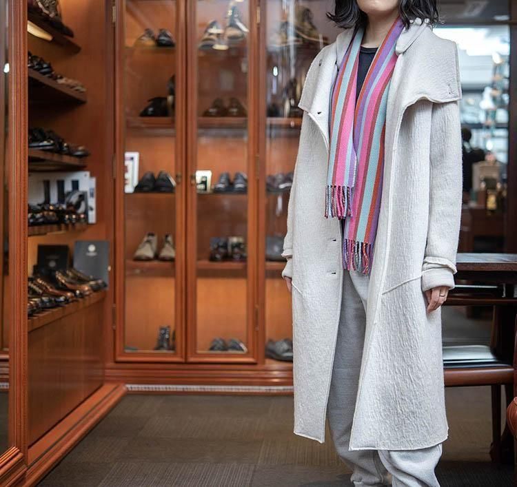 スタイルミニマルなロングラインのコート。縦に流れるシルエットが美しく、柔らかなニュアンスとエレガンスを伴うデザイン。