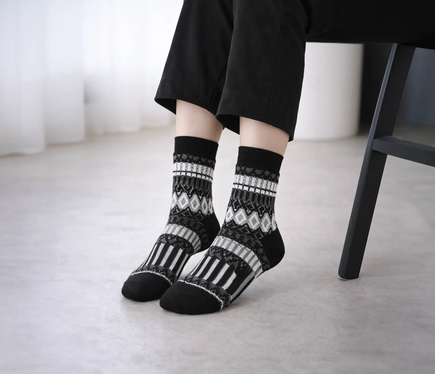 ayame W-AYAME×C53 ICHI 1(Black × White)は、横段、ダイヤ、ストライプという複数の幾何学要素を秩序立てて配置した、視線の流れが美しいソックスです。モノトーン配色により柄の立体感が強調され、主張はありながらも過度にならず、足元を知的に引き締めます。ロゴは控えめに配置され、全体のバランスを崩さない点も印象的です。