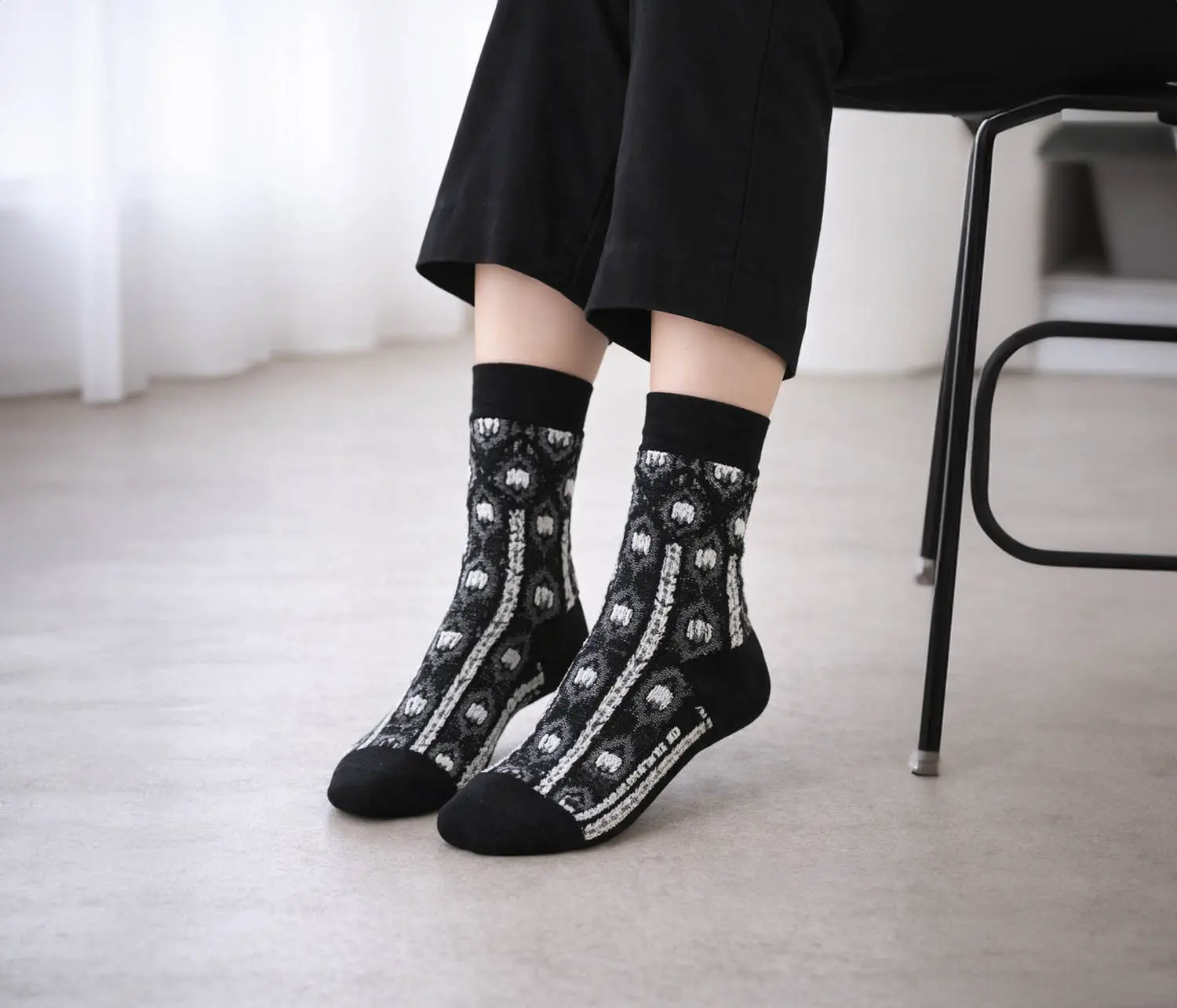 AYAME × C53 ROKU 6(Black × White)は、表裏どちらも主役として使えるリバーシブル仕様のソックスです。ジャカード編みによって描かれた異なるパターンは、裏返すことでまったく違う印象に変化します。モノトーン配色ならではのコントラストが足元に奥行きを生み、靴やスタイリングに合わせて表情を切り替えられる柔軟さが魅力です。